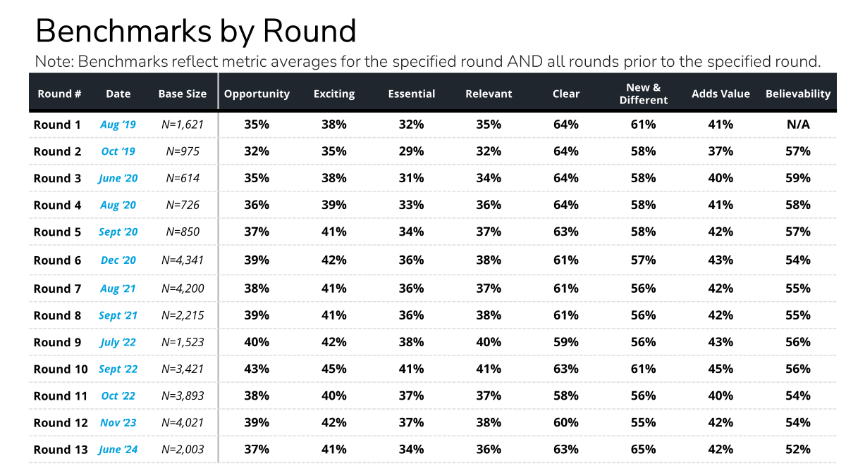Note: Benchmarks reflect metric averages for the specified round AND all rounds prior to the specified round. The image below the idea insight page shows these benchmarks by round.